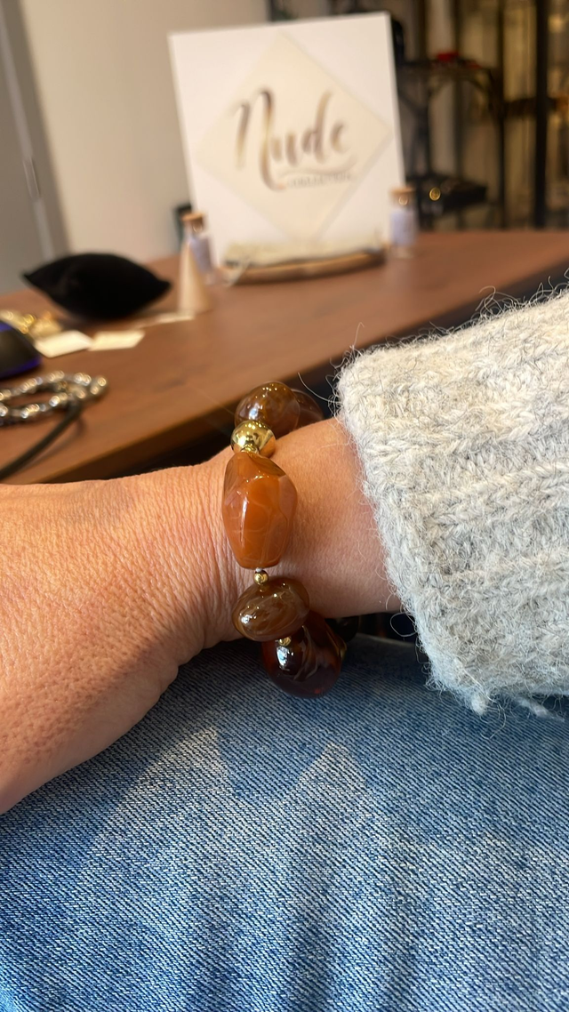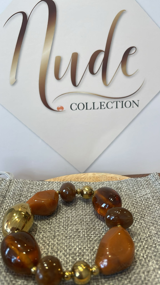 Bracelet aux superbes perles en résine effet ambre, aux reflets chauds et lumineux, associé à des perles en acier doré.