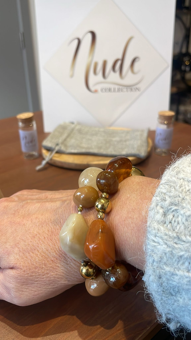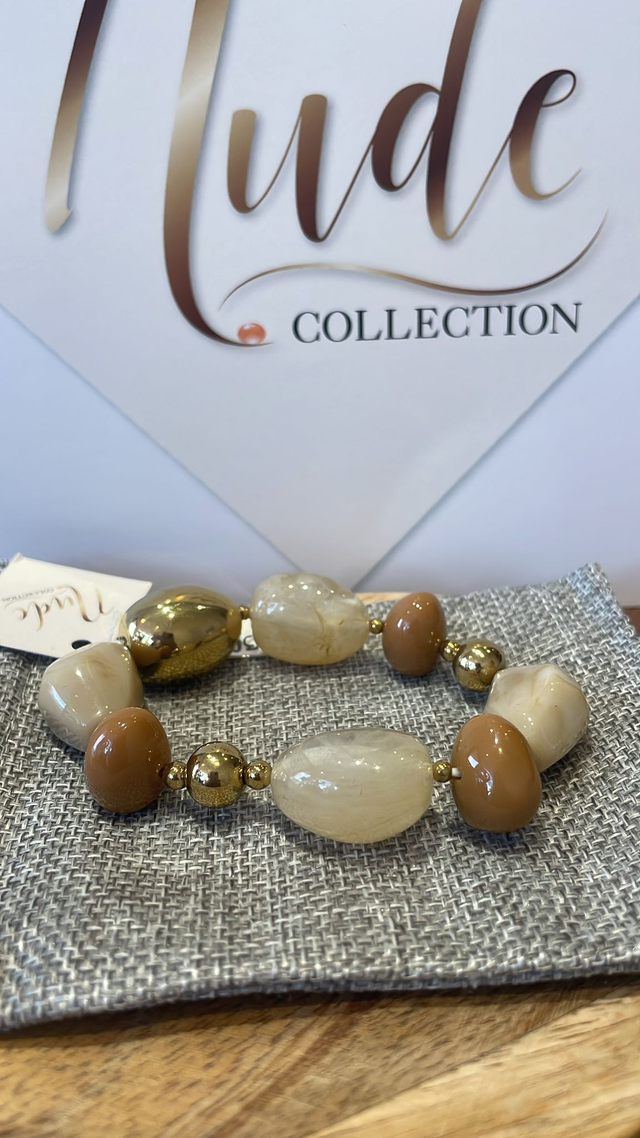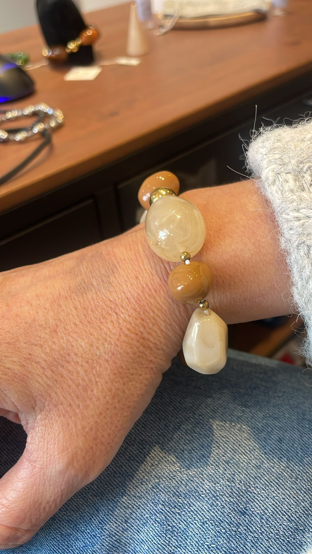 Bracelet composé de perles en résine aux tons beige, crème et caramel clair, sublimé par des perles en acier doré.