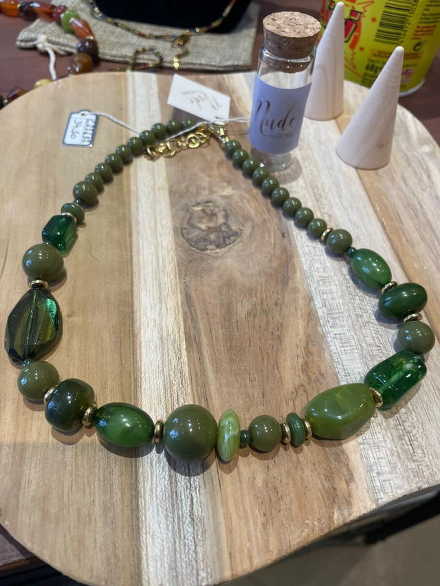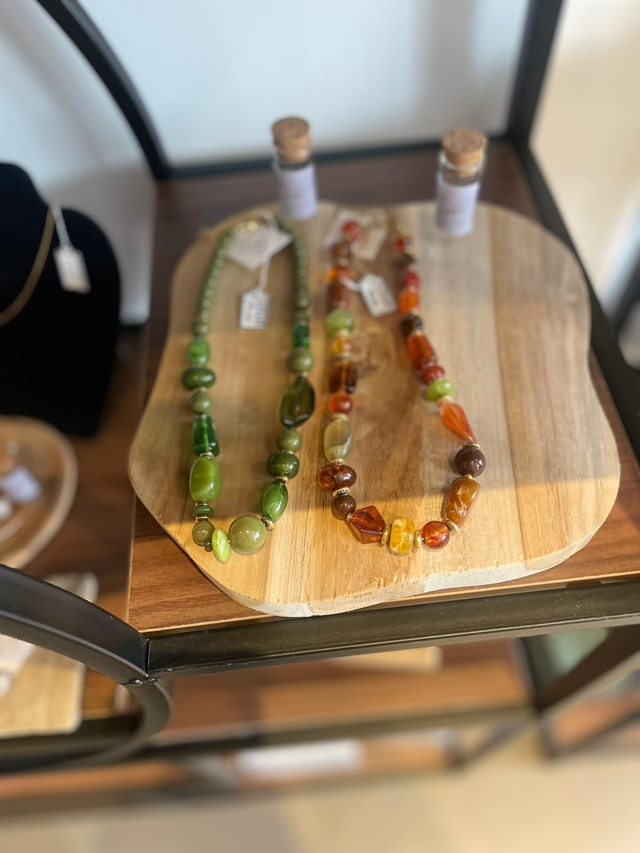 Collier élégant composé de perles aux teintes naturelles, disponible en version vert profond ou ambre chaleureux.