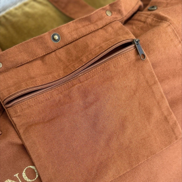 Grand sac cabas 100 % coton délavé pour un look hyper stylé et décontracté, coloris caramel avec son imprimé pailleté or "Family Love en Vadrouille" Poche intérieur avec fermeture éclair pour y glisser vos clefs, porte monnaie, paire de lunettes... Fermeture du sac par bouton pression.