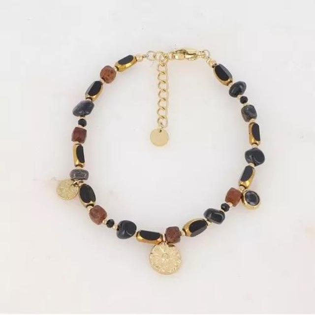 Bracelet réglable composé d'un joli enfilage de perles en pierres naturelles, pâte de verre et embelli de pampilles dorées